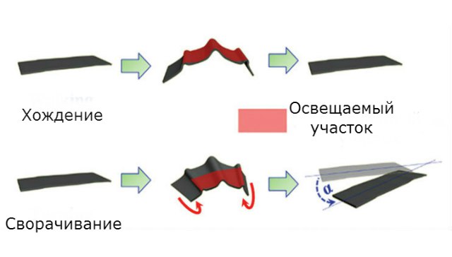 Ван и его коллеги использовали слоистый материал, чтобы создать "ходящего" робота, работающего от импульсного света. Так, если направить инфракрасный свет лишь на одну сторону шагающего робота, он сложит лишь эту сторону и в результате повернёт.