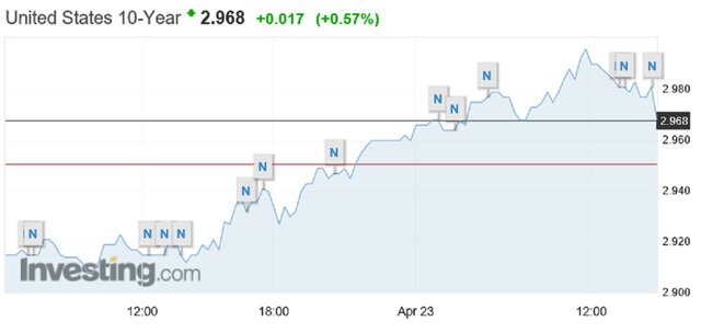 В-третьих, остается перераспределение финансовых потоков, связанное или с уходом от рисков, или со структурой других финансовых активов в интересах крупных инвестиционных домов. Но риски как раз вроде бы снизились: обстрел сирийской территории США, Великобританией и Францией представляется спустя неделю разовым показательным пиар-ходом, северокорейский Ким Чен Ын идет на мировую∎ Очевидно, время рассмотреть положение других финансовых активов – и здесь обращает на себя внимание свежий пик доходности в американских облигациях – например, хорошо видный на доходности эталонных 10-летних казначейских бумаг.