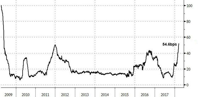 Ожидания эти приводят в росту стоимости долларовых заимствований по всему миру. Мы уже неоднократно писали, что ключевой индикатор стресса на рынках (LIBOR-OIS) демонстрирует резкий рост и уже достиг уровней, которые наблюдались во время европейского долгового кризиса.