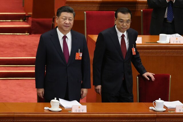 Председатель КНР Си Цзиньпин (слева) и премьер Госсовета КНР Ли Кэцян (справа) на открытии 1-й сессии Всекитайского собрания народных представителей 13-го созыва. Пекин, 5 марта 2018 года. Фото: EPA-EFE/WU HONG