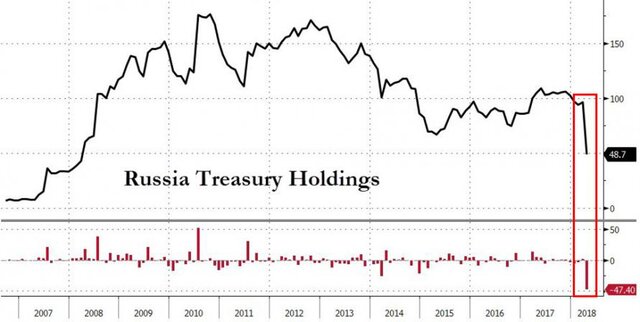 Россия вдвое сократила вложения в гособлигации США. В апреле, когда Штаты ввели санкции в отношении "Русала" и ряда других компаний, Банк России продал [B]половину[/B] казначейских облигаций США почти на $47,5 млрд - до минимума с марта 2008 года.