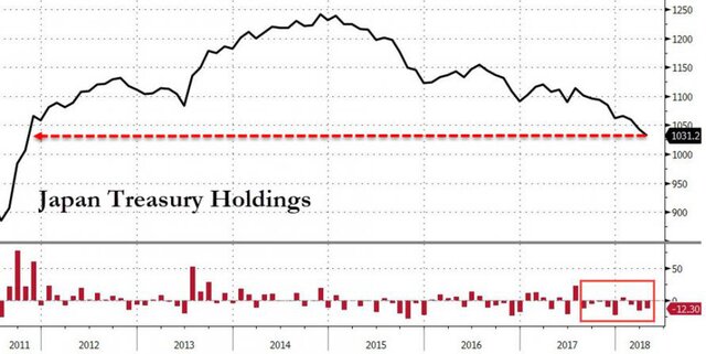 Одним из наиболее активных продавцов стал до недавнего времени ближайший союзник Штатов - Япония. Объем трежерис в резервах снизился до минимума с октября 2011 года, при этом Япония продает облигации США в течение 8 из последних 9 месяцев.