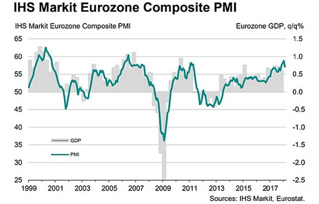 Сводный индекс деловой активности (Purchasing Managers Index, PMI) 19 стран еврозоны в феврале опустился с январского уровня 58,8 до 57,1 пункта, свидетельствуют окончательные данные IHS Markit. Предварительная оценка составляла 57,5 пункта.