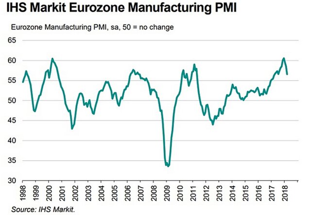 Индекс менеджеров закупок (Purchasing Managers Index, PMI) в производственном секторе 19 стран еврозоны опустился с февральского уровня 58,6 до 56,6 пункта. Предварительная оценка также составляла 56,6 пункта.