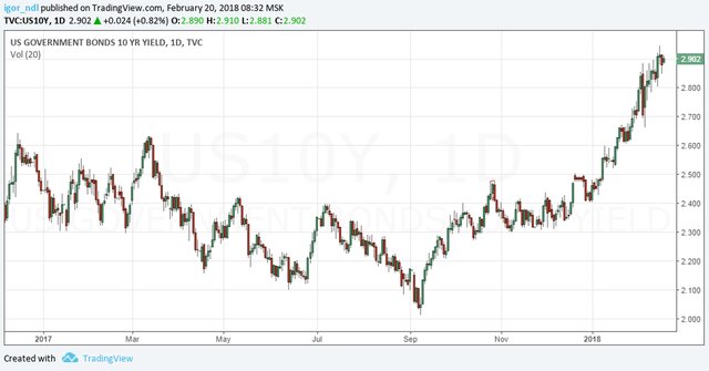 "В 2017 г. сбалансированный портфель, в котором на долю акций приходилось 60%, а на долю облигаций - 40%, приносил одни из лучших с 1960-х гг. доходов с учетом риска, поскольку бонды дорожали вместе с акциями, а волатильность была очень низкой. Однако оказавшийся выше ожиданий рост инфляции и связанное с этим усиление неопределенности нарушили идиллию, вызвав существенное увеличение волатильности ставок, которая перекинулась на рынки акций".Напомним, что распродажи на рынке американского госдолга спровоцировали не только опасения по поводу роста ставок, но и так называемый двойной дефицит, то есть дефицит бюджета и дефицит счета текущих операций.
