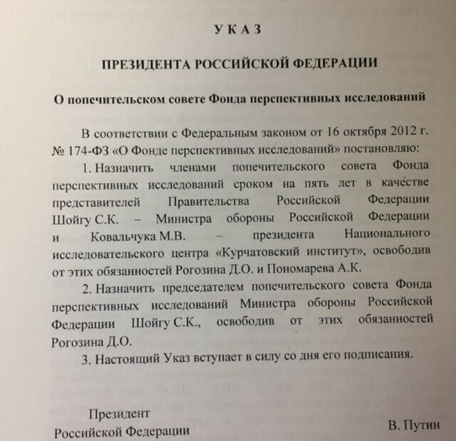 Другим проектом указа президента РФ также предлагается заменить председателя попечительского совета Фонд перспективных исследований вице-премьера Дмитрия Рогозина на министра обороны Сергея Шойгу. "Проекты фонда призваны играть определяющую роль в разработке ключевых элементов оружия, военной и специальной техники нового поколения. Они должны стать основой отечественной системы вооружения на рубеже 2025–2030 годов, причём как для армии и флота, так и для ряда других отраслей производства и для других силовых структур", - цитируется на сайте ФПИ слова Владимира Путина.Среди проектов фонда - квантовые модели для противодействия информационным угрозам в соцсетях, проект антропоморфного робота FEDOR.