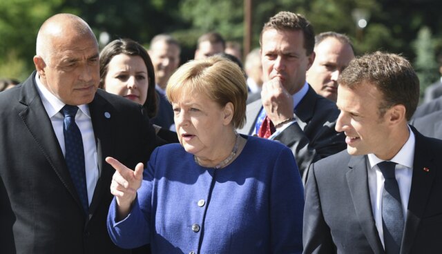 Слева направо: премьер-министр Болгарии Бойко Борисов, канцлер ФРГ Ангела Меркель и президент Франции Эммануэль Макрон. София, 17 мая 2018 года. Фото: EPA-EFE/VASSIL DONEV
