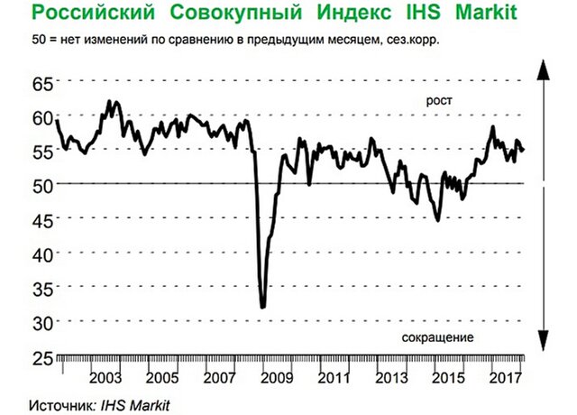 Показатель ниже 50 пунктов отражает снижение активности, выше - рост активности.