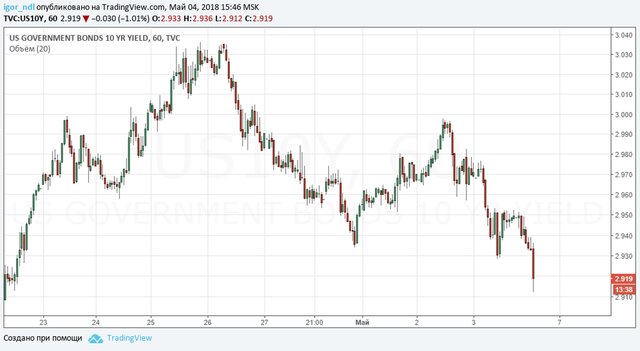 Основной фактор - снижение доходностей по американским долговым бумагам. Сегодня доходности по десятилетним трежерис опустились ниже отметки в 2,92%, а ведь еще буквально несколько дней назад показатель превышал психологически важную отметку в 3%.