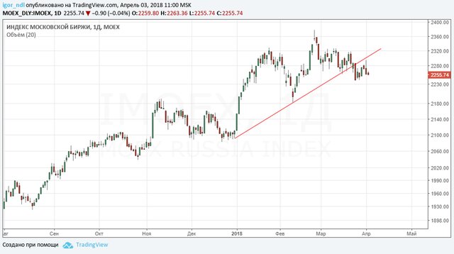 Индекс Мосбиржи также не демонстрирует ни единого повода для оптимизма. В конце марта была пробита линия поддержки, а накануне мы увидели ретест этого уровня, после чего падение продолжилось. Вполне возможно, оно будет длительным.