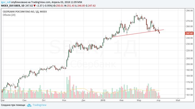 По итогам 2017 года общий объем средств, размещенных населением на фондовом рынке, впервые в истории превысил триллион руб (1,16 трлн). Такие данные приводит Национальная ассоциация участников фондового рынка (НАУФОР) после опроса крупнейших брокерских и управляющих компаний. На брокерские счета, позволяющие торговать акциями, валютой, облигациями, фьючерсами и опционами, граждане РФ принесли 700 млрд руб. - вдвое больше, чем год назад. Общая сумма инвестиций, сделанных через брокеров, подскочила в 1,6 раза - с 520 до 850 млрд руб.Прежде всего стоит обратить внимание на главную и самую сильную бумагу рынка РФ в последние годы - "Сбербанк". Фигура, которая сформировалась на графике, очень похожа на фигуру технического анализа "голова и плечи", которая является разворотной и предрекает длительное нисходящее движение.