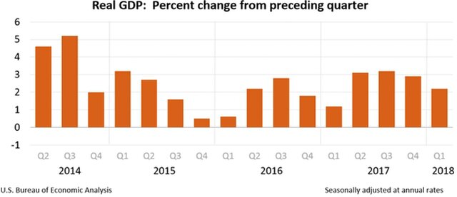 Аналитики, опрошенные Bloomberg, ожидали, что оценка роста будет сохранена на уровне 2,3%. В IV квартале 2017 года ВВП увеличился на 2,9%.