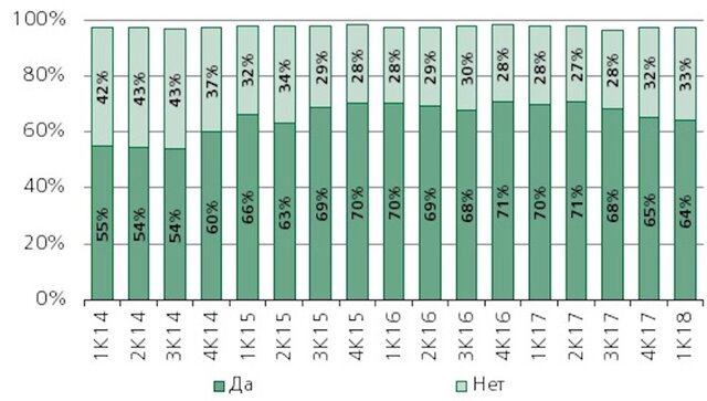 Норма сбережений, которая в минувшем квартале достигла 7,2%, в четвертом квартале 2017 года протестировала рекордный минимум на уровне 6,5%, а годом ранее составила 7,0%. Доля респондентов, которые в предыдущие два-три месяца пытались сэкономить на основных продуктах питания (т. е. ограничивали импульсные покупки и отдавали предпочтение сравнительно дешевым товарам), постепенно сокращается со второго квартала 2017 года. По итогам последнего квартала она составила 64%, что на 6 п. п. ниже уровня годичной давности и на 1 п. п. ниже, чем в четвертом квартале прошлого года.
