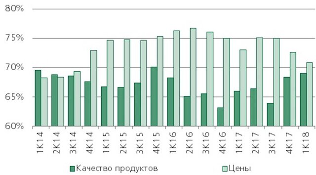 Текущий показатель – самый низкий с конца 2014 года, он близок к уровням, наблюдавшимся до экономического спада. Доля потребителей, которые в качестве определяющего фактора назвали качество продуктов, увеличилась на 1 п. п. по сравнению с предыдущим кварталом и на 3 п. п. относительно уровня годичной давности – до 69% (это соответствует среднему показателю за первую половину 2014 года).