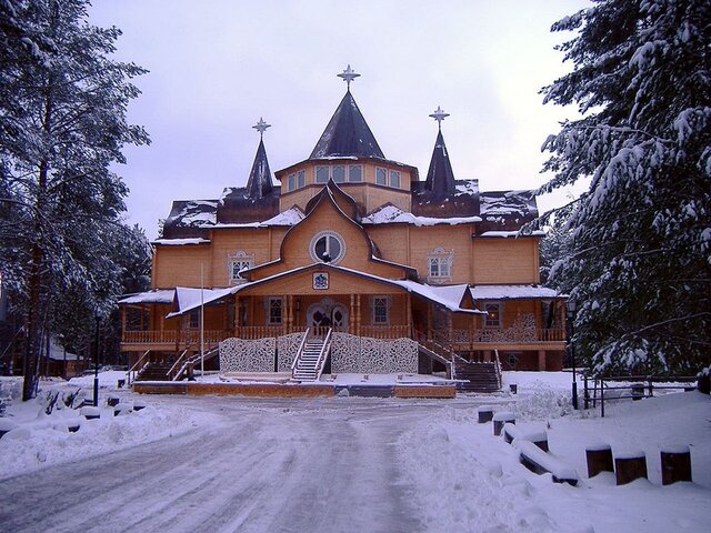 Дом Деда Мороза представляет собой двухэтажный терем-сруб, украшенный традиционными резными узорами и декоративными элементами из дерева.