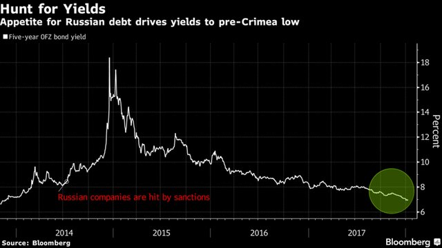США санкционировали некоторые крупнейшие российские компании в 2014 году, запретив инвесторам покупать новые облигации и акции от эмитентов, включая "Роснефть" и ВТБ. Это произошло в качестве наказания за роль Кремля в кризисе в Украине. Несмотря на то, что этот шаг вызвал скачок в доходности еврооблигаций компаний, их затраты по займам с тех пор упали ниже уровня, отмеченного до установления санкций.