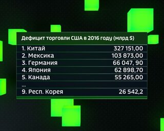 Отрицательное сальдо торгового баланса США с Китаем в январе 2018 года увеличилось на 16,7% - до $36 млрд, максимального уровня с сентября 2015 года. Дефицит внешнеторгового баланса США в целом в первый месяц текущего года подскочил до максимума более чем за 9 лет. Сокращение дефицита на $100 млрд будет соответствовать снижению показателя на 26,7%, тогда как в случае озвученной Дональдом Трампом суммы - лишь 0,3%.