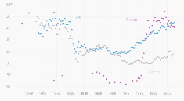 Несмотря на мировую известность российских олигархов, нечасто можно увидеть Россию на вершине графика неравенства доходов. Вероятно, потому, что официальные данные правительства явно приукрашивают ситуацию. Эти новые данные взяты из работы французского экономиста Томаса Пикетти, который зафиксировал данные за более чем столетие российских тенденций в отношении распределения богатства.
