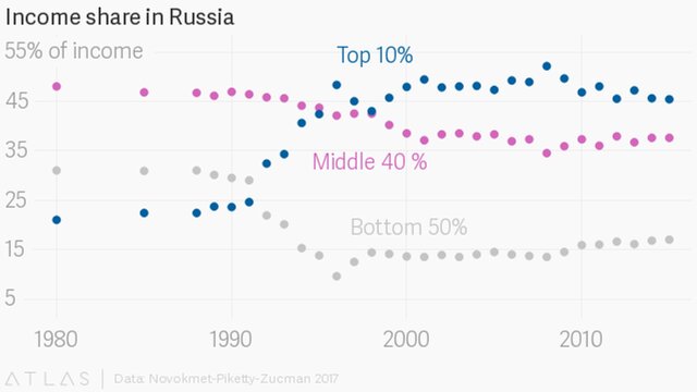 Быстрый переход страны к неравенству начался с краха СССР. Пять лет спустя доля дохода, получаемого самыми высокооплачиваемыми 10% работников, выросла почти вдвое с 25% в 1991 г. до 48% в 1996 г., так как началась приватизация. С тех пор эта доля осталась примерно на том же уровне, сохранившись во время эпического российского "бычьего" рынка в период с 1998 по 2008 гг., и снизилась лишь после финансового кризиса и резкого падения цен на нефть.