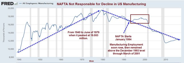 NAFTA не несет ответственности за потерю производственных рабочих мест. Количество производственных рабочих мест достигло пика в июне 1979 года, почти за 15 лет до НАФТА. Обратите внимание, что рабочие места на производстве выросли в течение первых 8 лет после начала НАФТА.