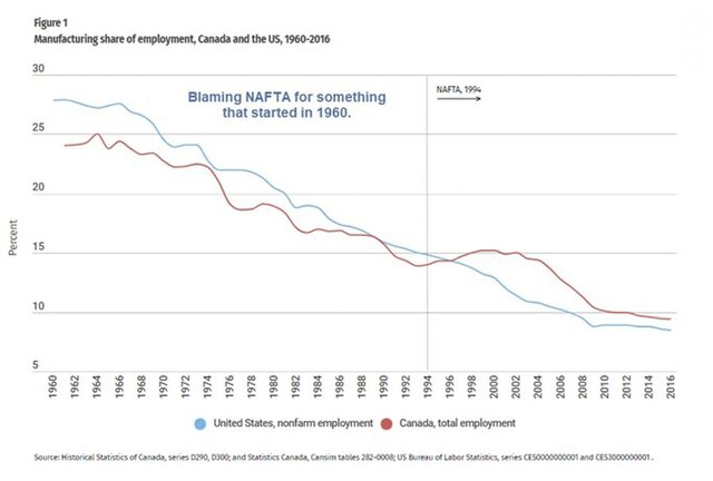 Каждый раз, когда заходят разговоры о торговле, по крайней мере, один плохо информированный читатель обвиняет NAFTA в потере производственных рабочих мест.
