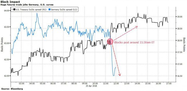 Разрыв между двумя кривыми в понедельник увеличился до пиковых с января 48 базисных пунктов и приближается к уровням, которые не наблюдались с 2000 г. Сразу после этих крупных транзакций наклон кривой США вырастал до максимумов торговой сессии, в то время как немецкая кривая опускалась до минимумов дня.