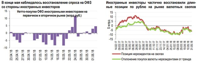 О росте спроса на российские активы свидетельствует рост длинных позиций по рублю на рынке валютных свопов в объеме около $1,5-2 млрд. Доля российских облигаций федерального займа (ОФЗ) в собственности иностранцев в мае 2018 г. снизилась на 1,8 процентного пункта по сравнению с апрелем и на 1 июня составила 30,5%, по данным ЦБ. Вложения нерезидентов в денежном выражении во внутренний российский госдолг сократились к 1 июня до 2,123 трлн с 2,22 трлн руб. на 1 мая.