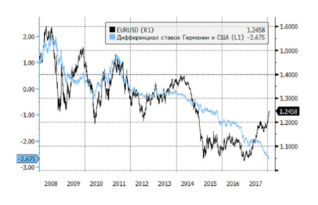 Следовательно, рубль больше зависит от пары евро-доллар, главной пары на рынке forex, чем от нефти. Продолжит доллар падать – все типы активов, включая российский рубль, продолжат рост. Но на евро-долларе давно назрел разворот. Уже год доллар падает вопреки повышению ставки ФРС на фоне продолжающейся сверхмягкой политики ЕЦБ и Банка Японии. Дифференциал ставок по 2-летнему долгу между США и Германией достиг максимума за последние 18 лет, но доллар все равно падает.