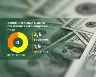 В 2016 г. после двухлетнего перерыва Российская Федерация успешно разместила два транша 10-летних еврооблигаций с погашением в 2026 г. по номинальной стоимости $1,75 млрд и $1,25 млрд с доходностью 4,75% и 3,90% соответственно, сообщали ранее "Вести. Экономика".