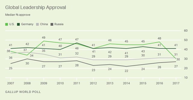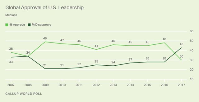 Лишь 30% опрошенных за пределами США одобряют действия американских властей. В 2016 г. "рейтинг одобрения" США, по данным Gallup, составлял 48%.