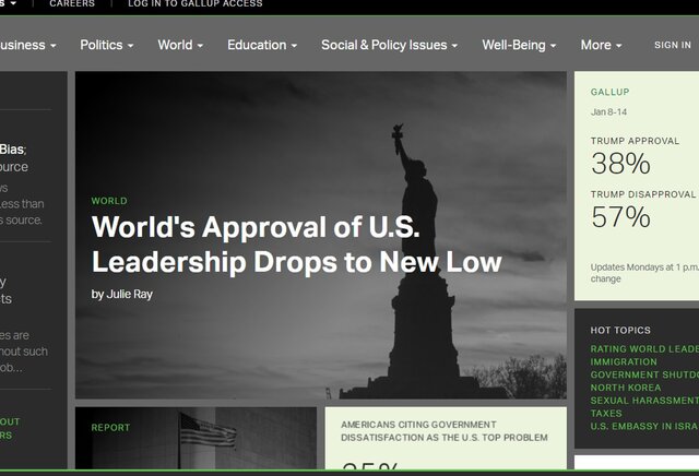 пресс-релизе исследовательской консалтинговой компании Gallup, опубликованном по итогам опроса общественного мнения, который был проведен в 135 странах мира в 2017 г. Одобрение политики США со стороны граждан других государств опустилось до рекордно низкого значения за всю историю проведения исследований по данной тематике.