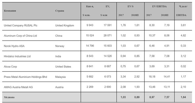 EBITDA увеличилась год к году на 42,4% до 2 120 млн долларов. Чистая прибыль по МСФО, относящаяся к акционерам выросла не так значительно – всего на 3,25% до 1 222 млн долларов. По состоянию на конец года "Русалу" удалось на 9,2% сократить величину чистого долга, но он все еще огромен - 7 649 млн долларов США, а отношение чистого долга к EBITDA, хоть и уменьшилось с 5,7х до 3,6х, все еще остается слишком велико.