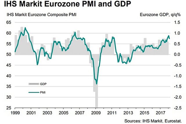 "Показатели PMI за первые два месяца квартала... свидетельствуют о том, что экономика еврозоны растет в квартальном выражении на 0,9% в первом квартале 2018 года", - сообщил главный экономист IHS Markit Крис Уильямсон.