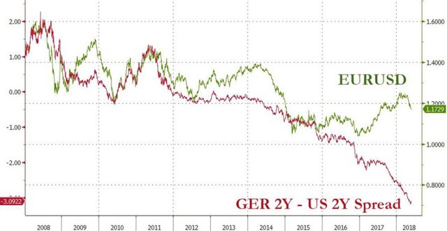 Если посмотреть на привычный фундаментальный показатель - разницу в ставках в евро и долларах, то динамика курса валюты значительно отстает от этого показателя.
