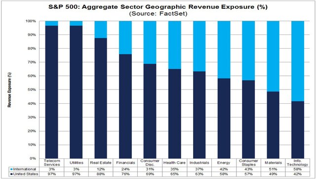 Ответ Китая не заставил себя долго ждать. С 6 июля Пекин введет 25% пошлины на импорт американской сельхозпродукции, автомобилей и других товаров. В случае развертывания полномасштабных торговых войн Штаты могут оказаться в проигравших. Инфляция в США может усилиться, так как американские производители тарифицируемой продукции получат возможность увеличить цены на нее. Как результат, ФРС вынуждена будет активизироваться в плане монетарного ужесточения. Помимо этого, КНР может отказаться от покупок Treasuries в свой портфель, что приведет к взлету доходностей гособлигаций США, а значит рыночных процентных ставок. Под ударом от действий Трампа могут оказаться ведущие корпорации США. На "зарубежные" рынки приходится около 39% выручки компаний индекса S&P 500 При этом сегмент информационных технологий генерирует около 58% выручки за пределами США.