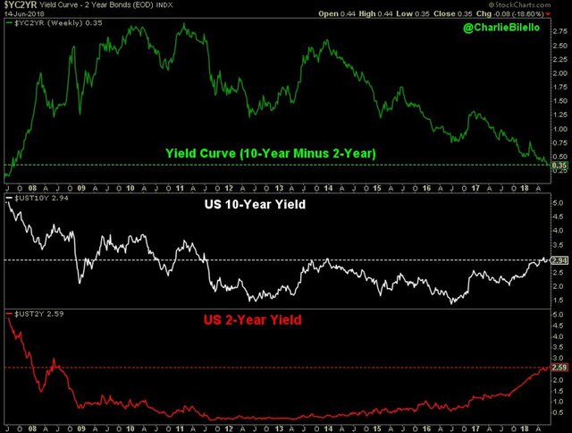 На этой неделе календарь макростатистики США не слишком загружен. Во вторник и среду будут опубликованы данные по рынку недвижимости за май. Наблюдается интересное расхождение. ФРБ Атланты, известный наиболее "свежими" оценками, прогнозирует 4,8% прирост ВВП США по итогам II квартала. Тем временем, "кривая доходности" Treasuries все более сглаживается (становится более плоской). Сглаживание кривой традиционно являлось признаком ослабления экономики, а переход в перевернутый вид – признаком надвигающейся рецессии. Спред между доходностями 10- и 2- летних Treasuries достиг минимума с августа предкризисного 2007 года.