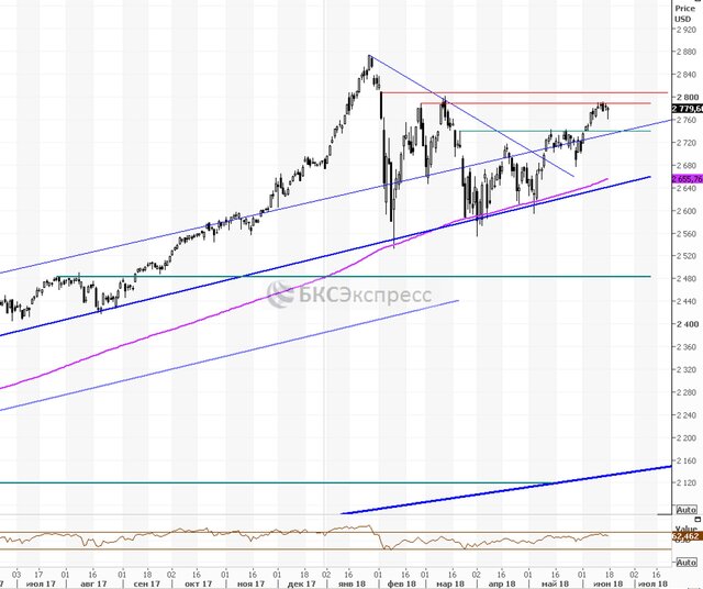 Индекс S&P 500 консолидируется под зоной сопротивления в 2790-2810 пунктов и падать пока не желает. При этом риски в виде торговых разногласий и цикла монетарного ужесточения ФРС явно на повестке дня. В случае новой волны снижения ближайшей целью по S&P 500 станет 2640 пунктов.