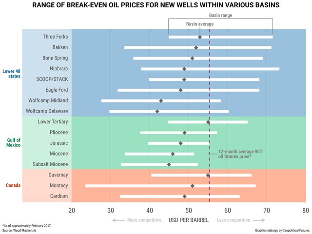 Этот график показывает диапазон безубыточных цен на нефть для новых скважин в США, в Мексиканском заливе и Канаде. Для многих из этих скважин точка безубыточности опустилась значительно ниже $60 за баррель.
