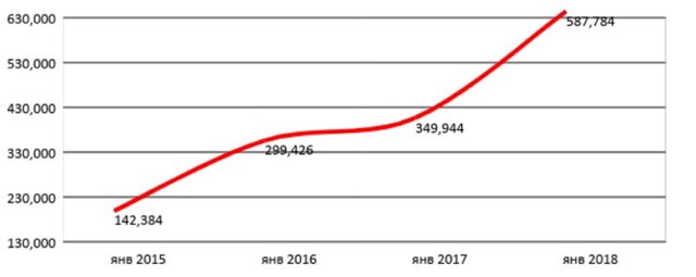 По данным 4,1 тыс. кредиторов, передающих сведения в Национальное бюро кредитных историй (НБКИ), в январе 2018 г. количество выданных новых кредитных карт составило 587,8 тыс. ед., что оказалось на 68,0% больше, чем было выдано за аналогичный период 2017 г. (349,9 тыс. ед.).
