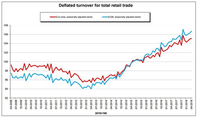 Розничные продажи в 28 странах ЕС в апреле выросли на 0,4% по сравнению с мартом и на 1,7% в годовом выражении.