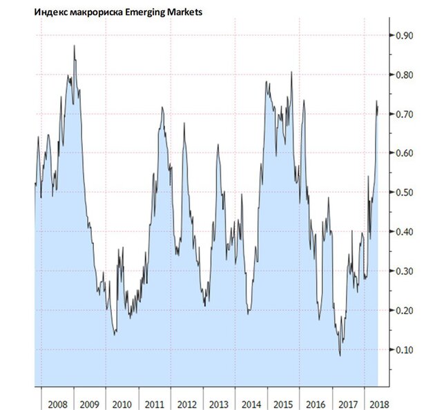 В целом ситуация на развивающихся рынках остается достаточно напряженной. Индекс макрориска emerging markets, рассчитываемый Citibank и отражающий восприятие инвесторами уровня риска на рынках "emerging markets" сигнализирует о предкризисном состоянии. Стоит отметить, что этот индекс нормируется таким образом, что его значения составляют от 0 (низкий уровень риска) до 1 (высокий уровень риска)