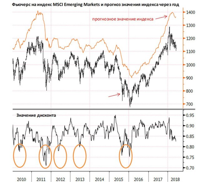 Индекс MSCI Emerging Markets (биржевых рынков акций стран с развивающейся экономикой), значительно выросший в последние пару лет, демонстрирует явные признаки слабости. В последнее время этот индикатор перманентно увеличивает дисконт к своему прогнозному значению через 12 месяцев, и текущий дисконт всё ещё далек от критических уровней по историческим меркам.