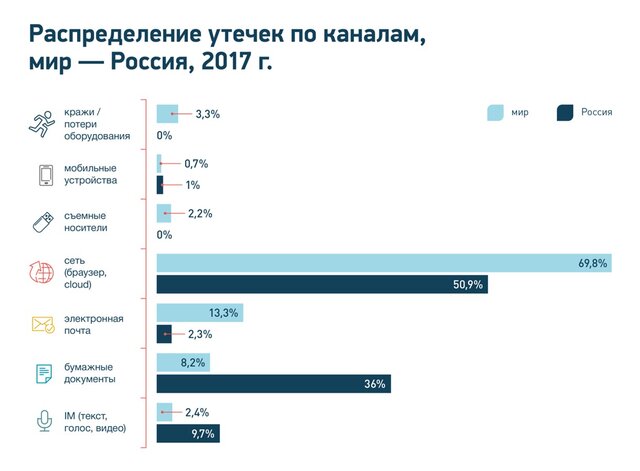 Большинство инцидентов в России пришлись на нарушения в работе рядовых сотрудников, которые составили 69% всех утечек информации в 2017 году. За год по вине высшего руководства и глав подразделений организаций произошло около 7% утечек данных в нашей стране. В мировой выборке, где существенно выше влияние внешних злоумышленников, значения этих показателей ниже и составляют около 50% и 2% соответственно. Чаще всего для кражи корпоративных данных в России использовался сетевой канал — браузер с подключением к интернету, и бумажные носители: на эти каналы в 2017 году пришлось 51% и 36% от общего числа инцидентов соответственно. Кроме того, в полтора раза по сравнению с 2016 годом — до 10% — возросла доля утечек информации с использованием сервисов мгновенных сообщений.