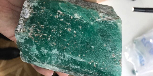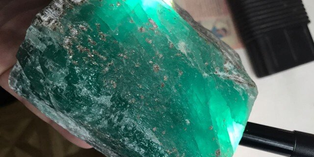 Длина изумруда составляет 14 см, ширина – 7 см. Камень уже прошел оценку сотрудников Гохрана РФ.