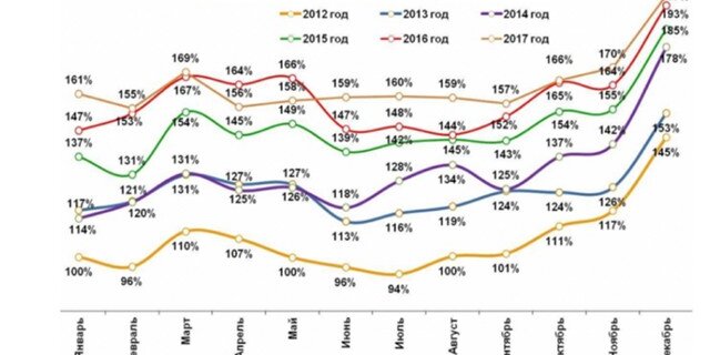 Россияне же с низкими доходами за последний месяц года потратили на 15,3% больше, чем в ноябре. Однако эти траты несравнимы с аналогичными показателями предыдущего года. По сравнению с декабрем 2016 россияне с низкими доходами сократили свои траты на -3,4%.