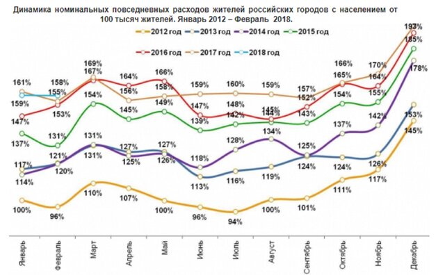 В городах с население от 100 тысяч жителей и до полумиллиона за месяц расходы жителей не изменились, а по итогам же года рост составил 5,8%.