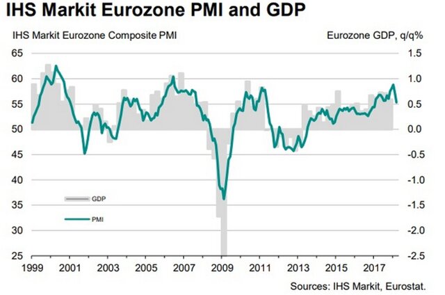 Сводный индекс деловой активности (Purchasing Managers Index, PMI) 19 стран еврозоны в марте опустился с февральского уровня 57,1 до 55,3 пункта.
