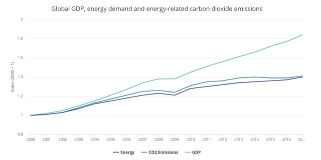 Одной из обнадеживающих тенденций является уменьшение связи между потреблением энергии и ВВП. На протяжении десятилетий экономический рост шел в ногу с потреблением энергии. Ослабление этой связи началось в середине 2000-х гг., когда глобальная экономика продолжала расширяться, а заоблачные цены на нефть заставляли искать более эффективные методы работы. С тех пор глобальная экономика росла намного быстрее, чем потребление энергии.