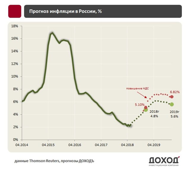 Цены на потребительские товары, облагаемые по стандартной ставке налога, вырастут в первые несколько недель после его повышения на 1.3-1.8%. Некоторые продовольственные товары (облагаемых по ставке 10%, которую пока обещано не повышать), такие как мясо, птица, яйца молоко, соль, сахар не должны подорожать. В целом инфляция в 2019 году может вырасти на 0,6-1,2% и прийти в норму к концу года. Мы ожидаем, что рост цен на пике (в середине 2019 года) может доходить до 7%, а в начале 2020 года вернется ниже 6%.