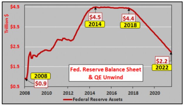 ФРС. В настоящее время дает возможность казначейским облигациям и MBS (ценным бумагам, обеспеченным закладными на недвижимость) погашаться, ежемесячно сокращая свой баланс. ФРС планирует сократить баланс примерно вдвое с $4,5 трлн до $2,2 трлн в период между нынешним периодом и до 2022 года. Это чистый рост долга в размере $250 млрд ежегодно помимо нового выпуска в $1 трлн.